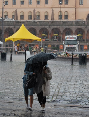 Et forrykende regnvær kom over sentrum i ettermiddag, og et telt falt omtrent